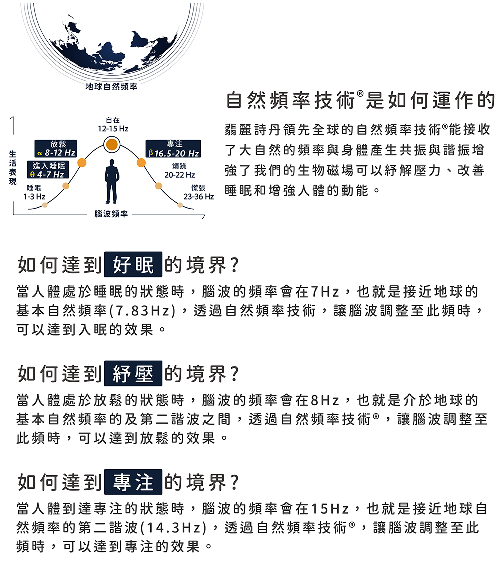 幫助人體接收自然頻率α波,使可感知的壓力降低,情緒平穩,長期使用可提升整體身心平衡